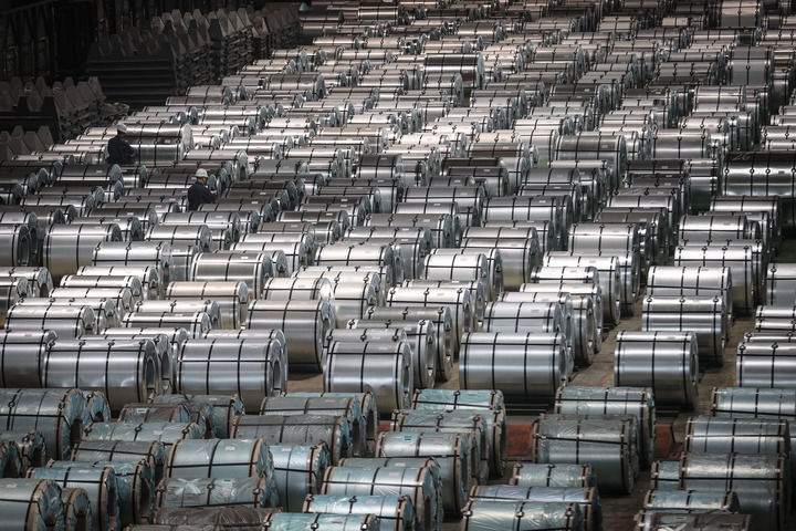 工人在鞍钢集团鞍钢股份冷轧厂四、五号镀锌线镀锌板卷成品区检查产品(2021年4月20日摄)。新华社记者潘昱龙摄